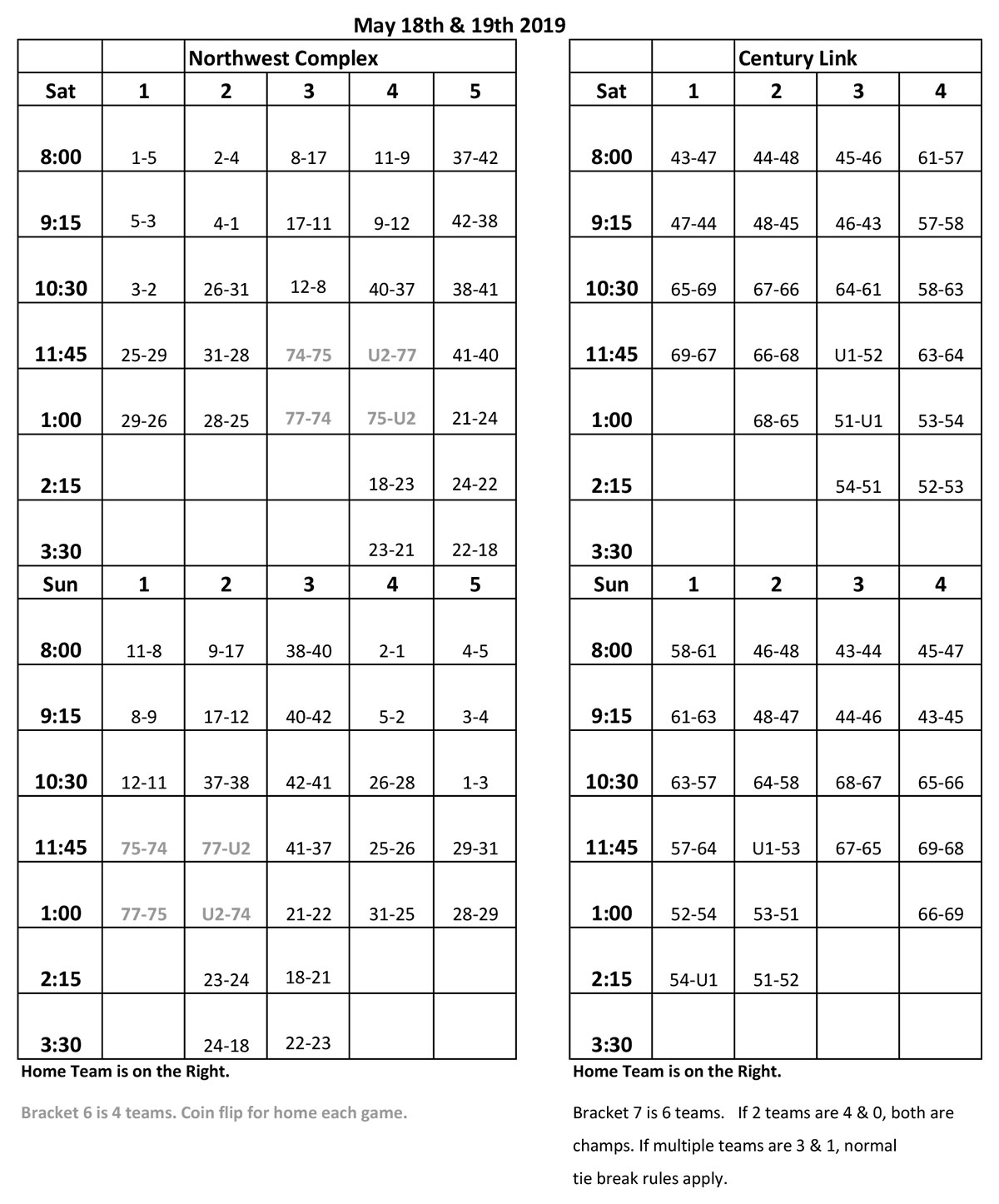Managers, if we complete Saturday's games, and your bracket does not play all 4 of the scheduled games, we will revert back to the 2 games that were completed on Saturday's schedule. Example: Bracket A plays 2 games Saturday but does not complete both games on Sunday. We revert back to the completed games from Saturday. That is the only way to be consistent, and fair, to all teams in the bracket.