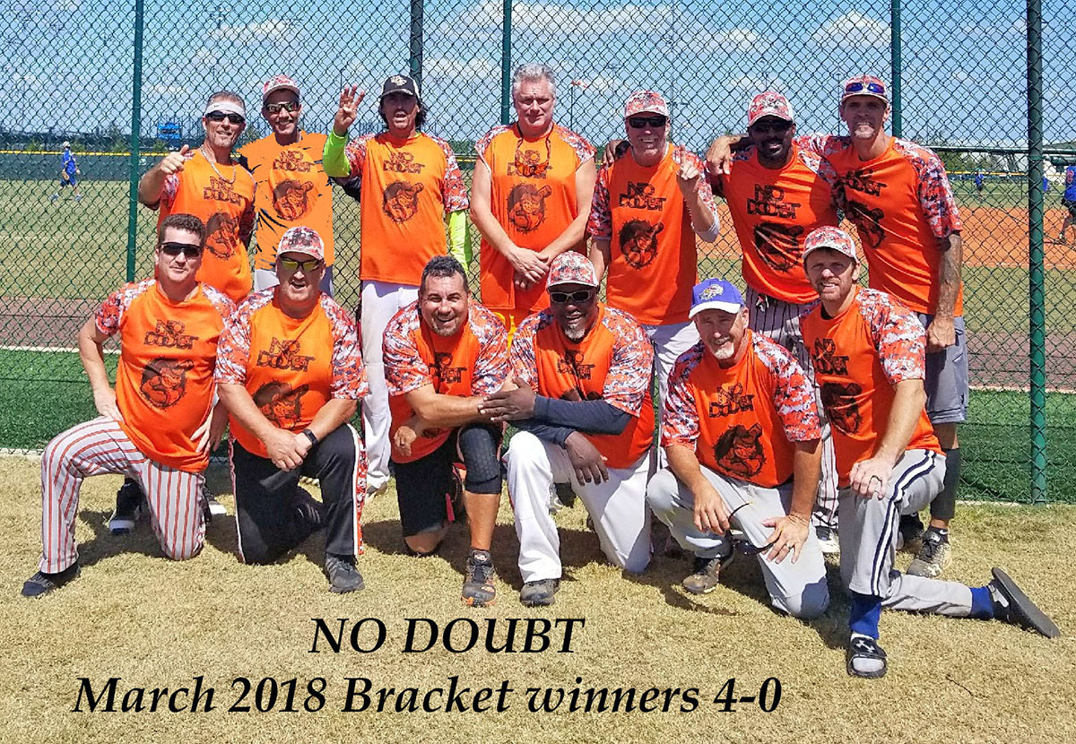 No Doubt is from the Orlando area, and only in its second year of playing together, but some of the relationships go back years. Many of the players, not all, are in recovery, some for decades. They have become responsible productive members of society. Playing softball allows us to stay healthy, act like children again, and keep our minds focused. We support each other both on and off the field, and enjoy our new-found softball family. In April of 2017 No Doubt was ranked 81; with winning of our bracket in the March 2018 tourney, we are now ranked 66. As we continue to build our team comradery, look for us to steadily climb up the leaderboard...NO DOUBT!