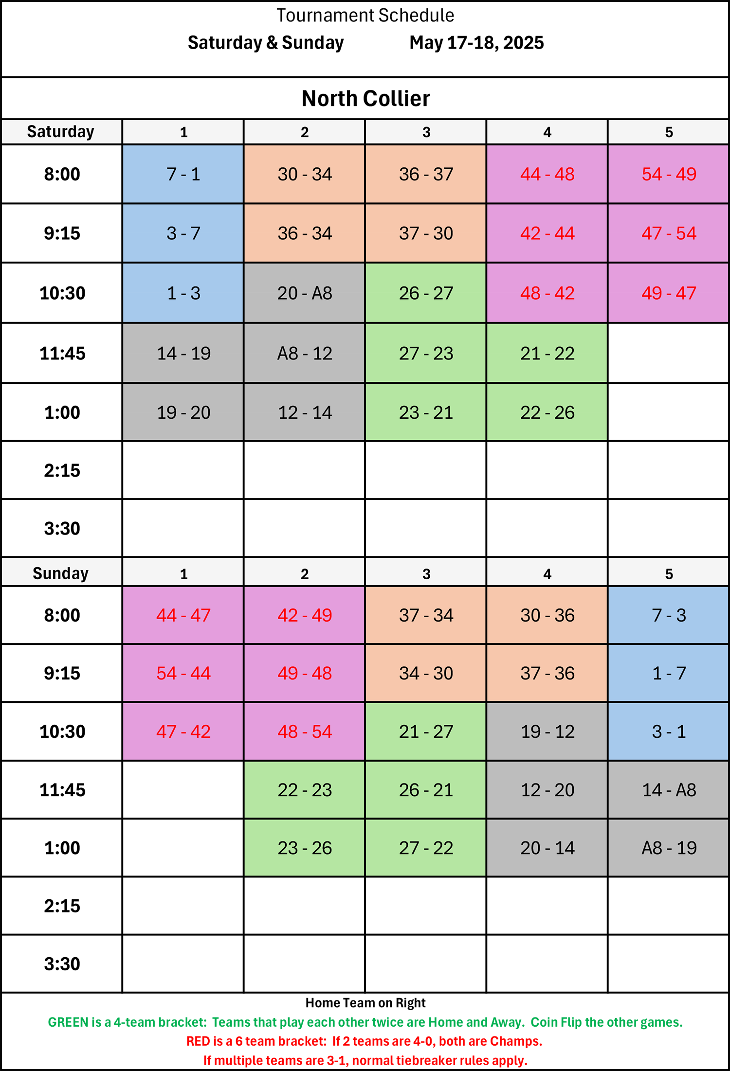 Home team on the right. | Brackets with 4 teams: teams that play each other twice are home & away. Coin flip the other games. | Brackets with 6 teams: if 2 teams are 4-0, both are champs. If multiple teams are 3-1, normal tiebreaker rules apply.