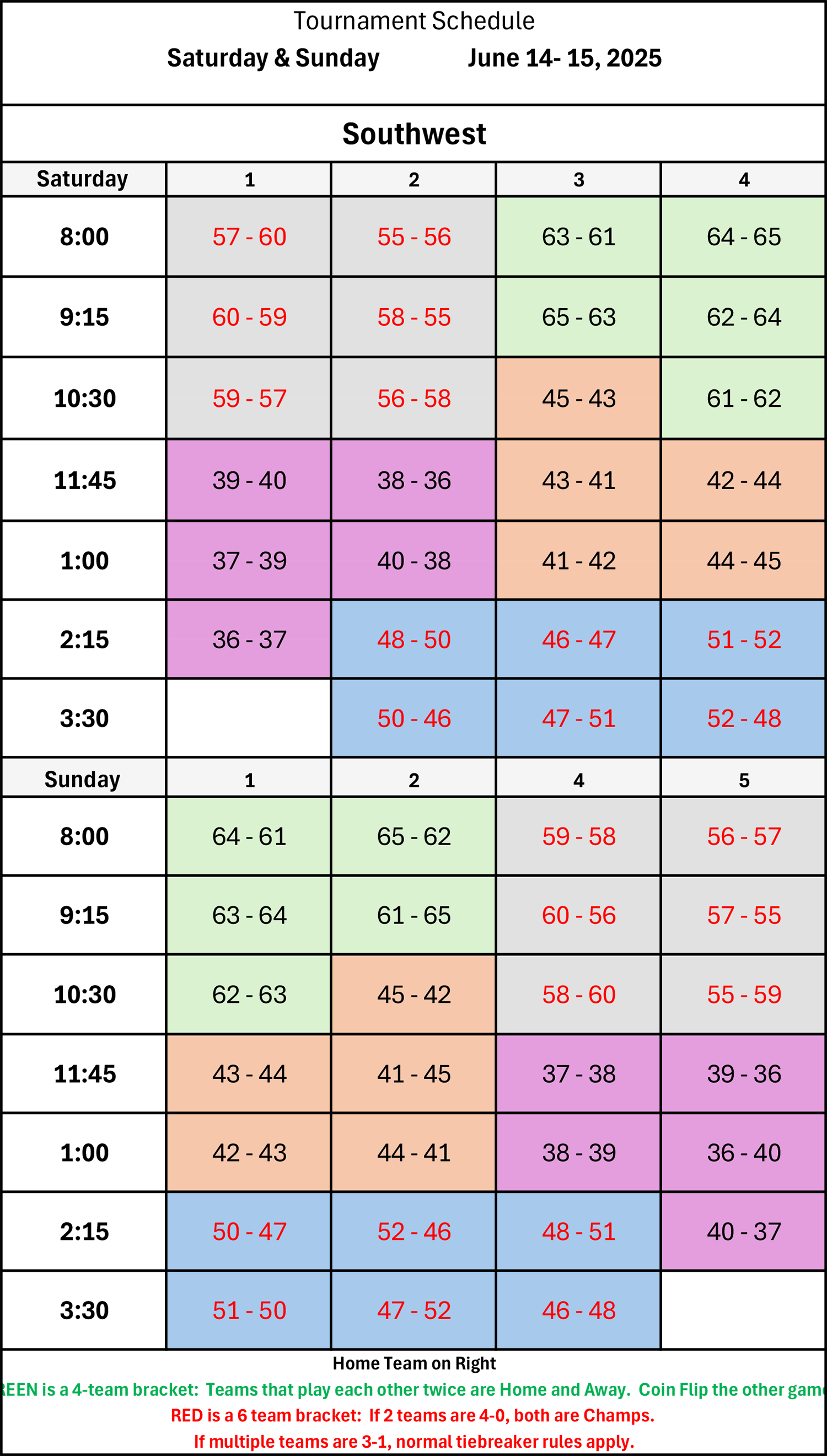 | 8:00 | 60 - 56 | 57 - 55 | 47 - 48 | 51 - 50 |