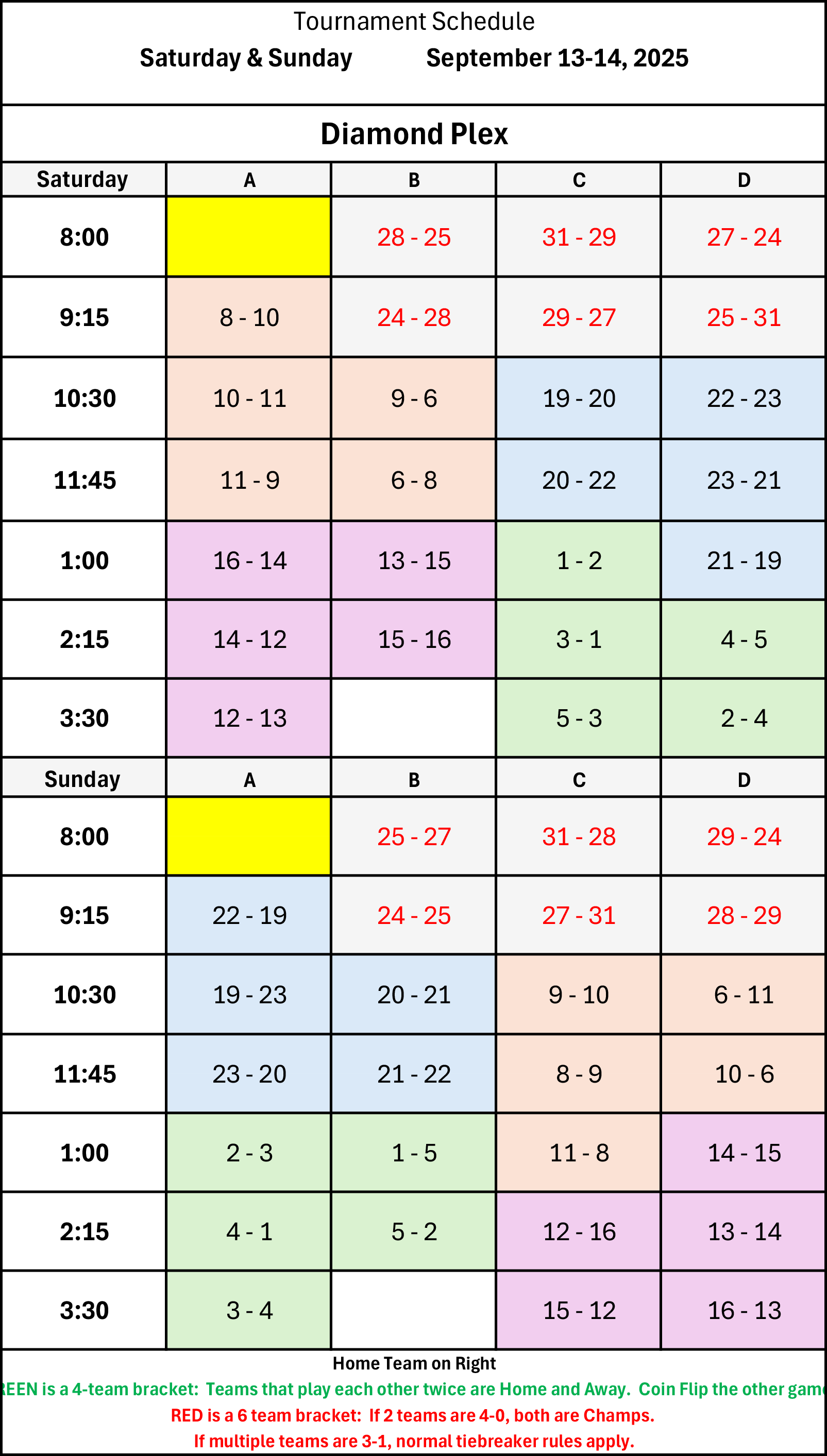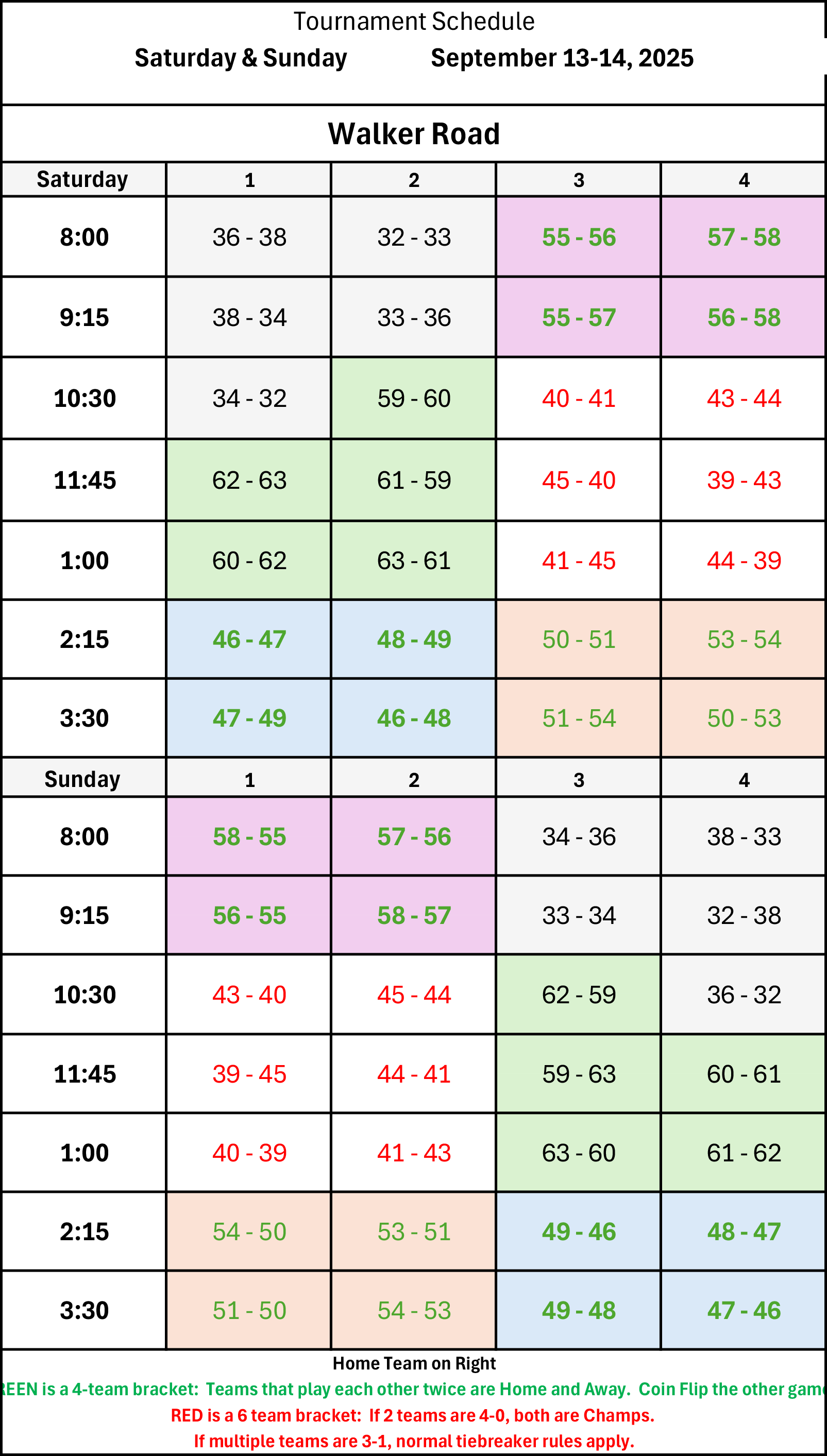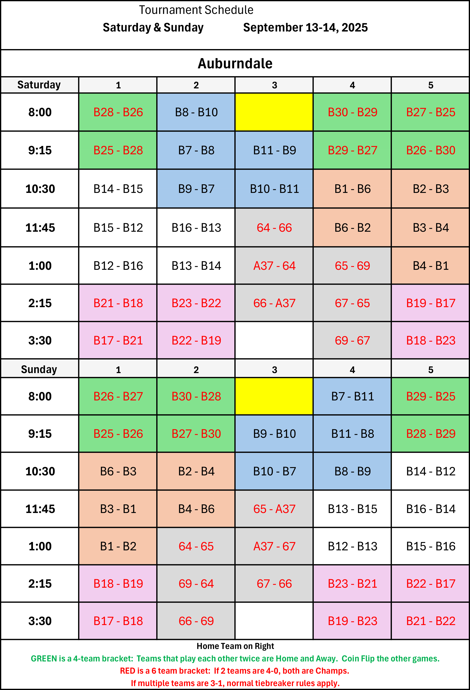 Home team on the right. | Brackets with 4 teams: teams that play each other twice are home & away. Coin flip the other games. | Brackets with 6 teams: if 2 teams are 4-0, both are champs. If multiple teams are 3-1, normal tiebreaker rules apply.