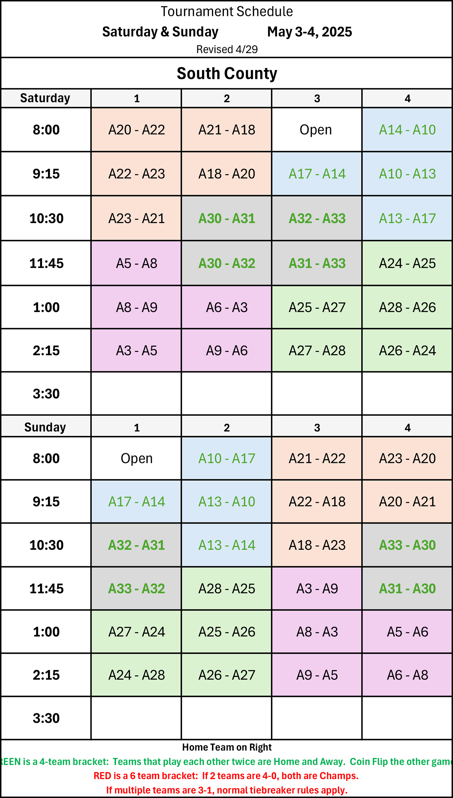 | 9:15 | A8 - A3 | A9 - A5 | A20 - A21 | A22 - A18 |